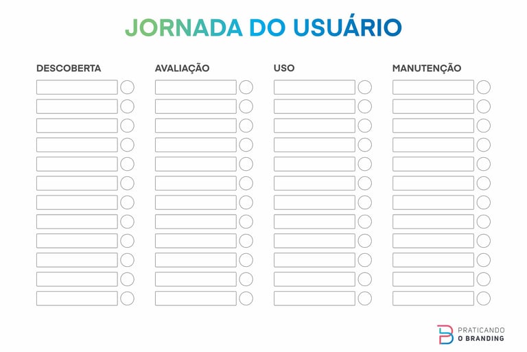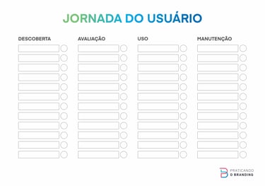 Com essa lista de pontos de contato, vou dar uma mãozinha e compartilhar uma ferramenta que eu adaptei de muitas outras sobre jornada do usuário. Depois de terminar de ler aqui e compartilhar com todos os amigos e amigas essa news, você pode até googlar “jornada do usuário” para estudar mais sobre esse mundo. Mas o que criei aqui é simples e prático, como disse antes, para já aplicar. Você só precisa listar os pontos de contato por momento. Lembrando a dica da última news: um mesmo ponto de contato pode se repetir em mais de um momento. O mais importante é você entender a função que ele terá naquele momento, certo?
