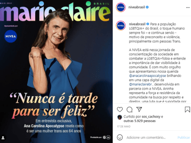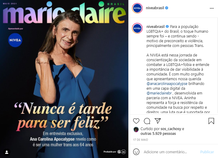 Outra inspiração é a história da Ana Carolina Apocalypse, uma influenciadora de 62 anos que contou o processo de transição de gênero após os 59 anos e conquistou muitos seguidores. É hoje uma embaixadora da Nívea.