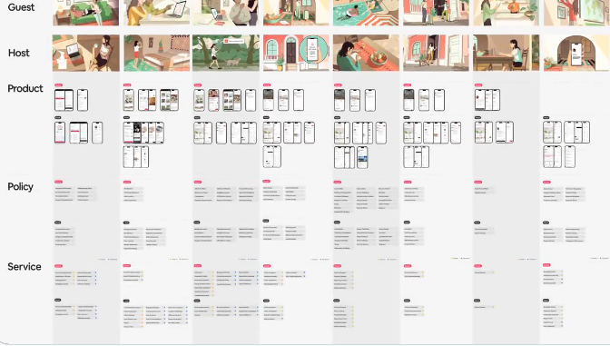 Todo esse processo de pesquisa usa o design de serviços como pilar, uma abordagem que busca criar experiências e interações positivas entre os usuários e os serviços do negócio. A experiência do usuário foi mapeada para entender os desafios e problemas de cada etapa. Veja o bluesprint (que é uma representação visual de um serviço ou experiência) publicado por Brian Chesky, cofundador e CEO do Airbnb: