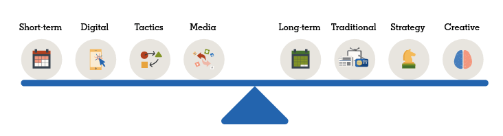 À medida que a novidade do marketing digital desaparece, fica claro que a verdadeira batalha não é de competição, mas de equilíbrio: • Curto prazo e longo prazo • Digital e tradicional • Tática e estratégia • Mídia e Criatividade.