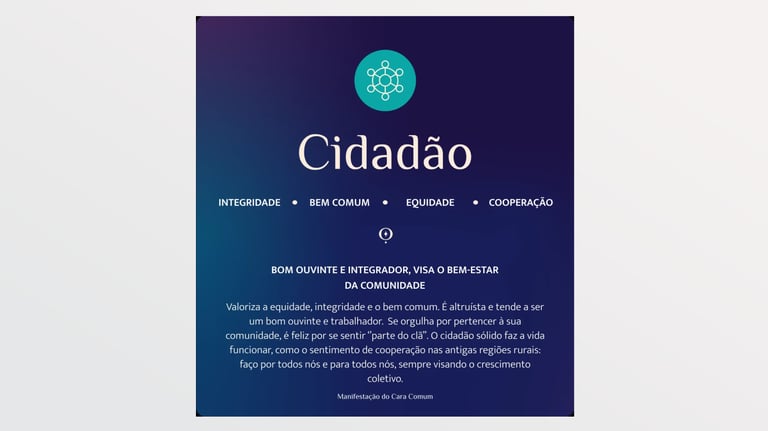 Valoriza a equidade, integridade e o bem comum. É altruísta e tende a ser um bom ouvinte e trabalhador. Se orgulha por pertencer à sua comunidade, é feliz por se sentir ‘’parte do clã’’. O cidadão sólido faz a vida funcionar, como o sentimento de cooperação nas antigas regiões rurais: faço por todos nós e para todos nós, sempre visando o crescimento coletivo. Veja o card do Cidadão do nosso Box. Teremos 60 cards digitais para aplicar nas ferramentas.